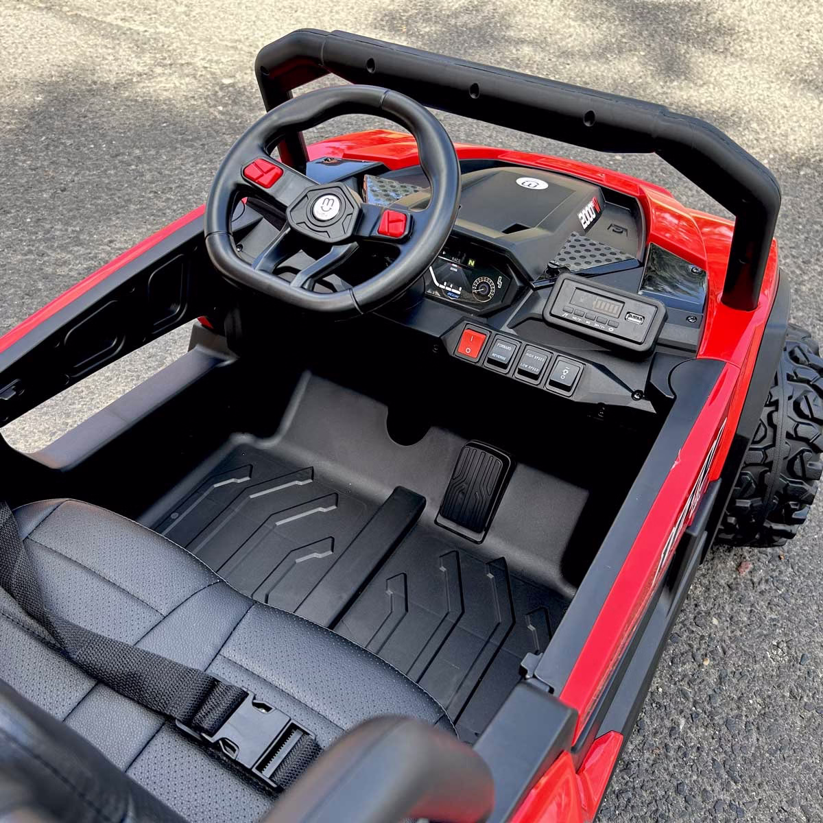 Dzięki wyprofilowanemu siedzeniu z ekoskóry i miękkim kołom EVA długa jazda jest niezwykle komfortowa, a pasy zapobiegają się wychylaniu z pojazdu.